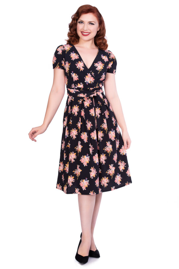 This 50s Kaya Floral Swing Dress in Black is guaranteed to put a smile on your face! This vintage gem features a beautiful wrap top with fine pleated detailing, fixed tie straps at the waist and from the waist down she flows into a semi-swing skirt for that real fifties look.